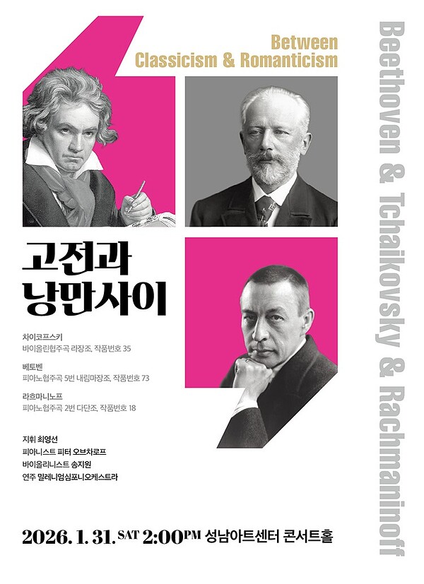 31 January 2026 고전과 낭만사이 (베토벤 & 차이코프스키 & 라흐마니노프)-성남 Time 2:00 PM Venue 성남아트센터 콘서트홀 Program Tchaikovsky violin concerto More Information Calendar