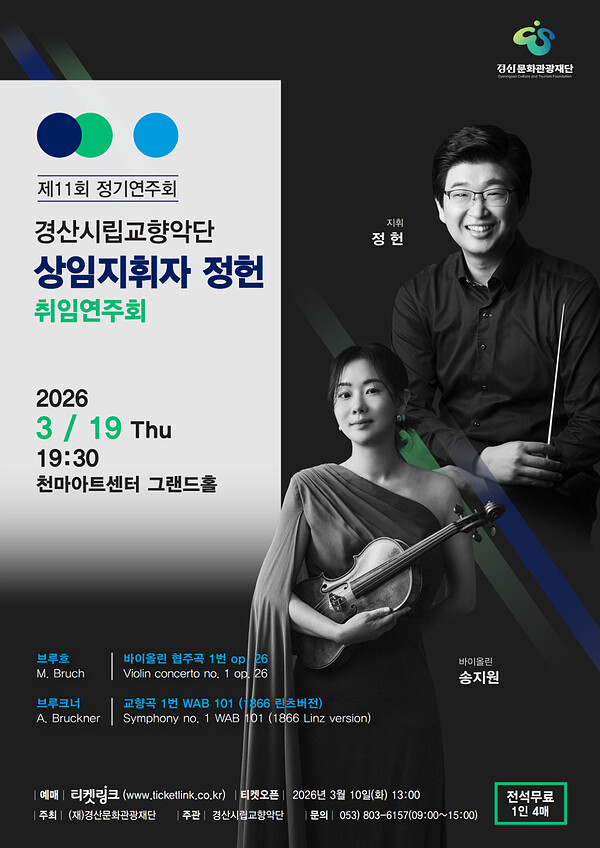 19 March 2026 경산시립교향악단 제11회 정기연주회 Time 7:30 PM Venue 천마아트센터 그랜드홀 Program bruch More Information Calendar